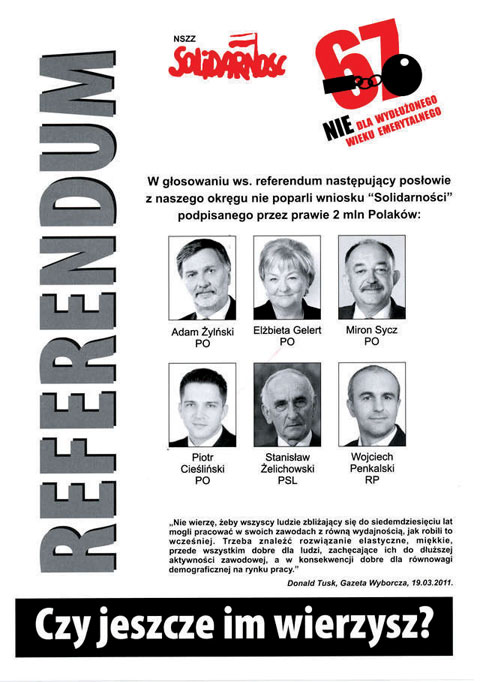 Twarze posłów z naszego okręgu, którzy nie poparli podpisanego przez prawie 2 miliony Polaków wniosku w sprawie organizacji referendum na temat reformy, znaleźli się na plakatach przygotowanych przez „Solidarność”. Pod napisem „Czy jeszcze im wierzysz” znaleźli się Adam Żyliński (PO), Elżbieta Gelert (PO), Miron Sycz (PO), Piotr Cieśliński (PO), Stanisław Żelichowski (PSL) i Wojciech Penkalski (RP).