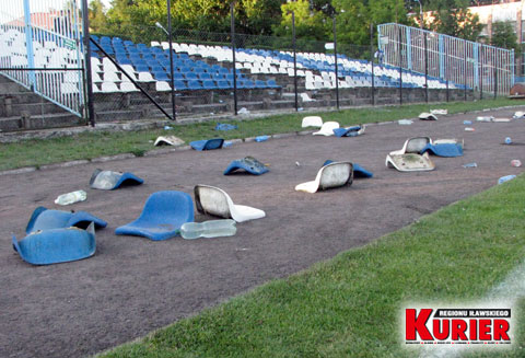 Po meczu. Zniszczone krzesełka przed sektorem iławian