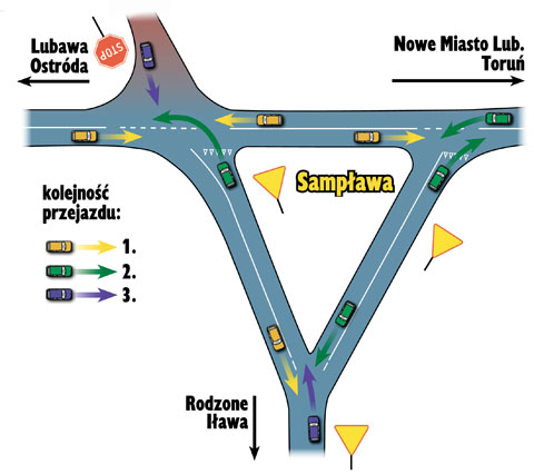 – Kierowca jadący od strony Iławy ustępuje temu, który zjeżdża z „piętnastki” od strony Nowego Miasta – tłumaczy Sławomir Kołpacki z iławskiej „drogówki”. – Ten z kolei musi ustąpić pierwszeństwa kierowcy jadącemu zjazdem od Lubawy.