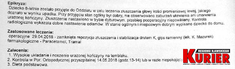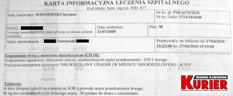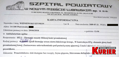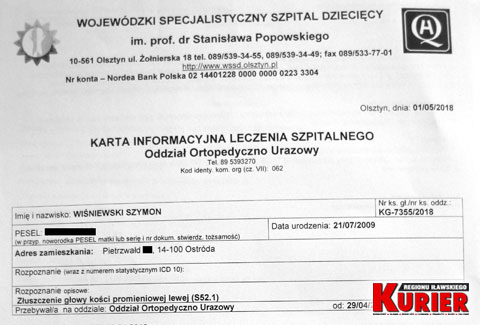 Karolina Wiśniewska zgłosiła się na iławski Szpitalny Oddział Ratunkowy z synem Szymonem, który po niefortunnym upadku skarżył się na ból łokcia. Wykonano prześwietlenie i stwierdzono stłuczenie. Wypisano chłopca do domu z zaleceniem opatrunków. Ręka jednak coraz bardziej puchła. Dzięki czujności matki dziecko ponownie trafiło do szpitala, ale tym razem w Nowym Mieście, gdzie stwierdzono złamanie łokcia z przemieszczeniem, a następnie do olsztyńskiego, w którym podczas operacji ustabilizowano rękę drutem. Poproszony przez nas o komentarz rzecznik iławskiego szpitala Tomasz Więcek milczy... od ponad 2 miesięcy.