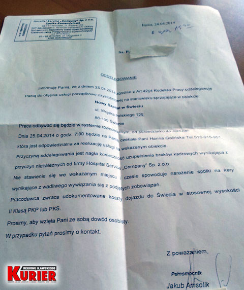 Sześć salowych z iławskiego szpitala, które zatrudnione są przez zewnętrzną, wrocławską firmę sprzątającą Impel, 24 kwietnia otrzymało pisma o oddelegowaniu do pracy w Świeciu (także w szpitalu).