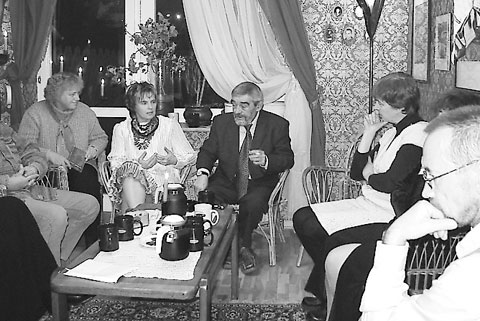 Janusz Olszewski to ten facet pośrodku – w głębi. Szpakowaty, z brodą. Zdjęcie pochodzi z saloniku literackiego w Łomży (2003 r.).