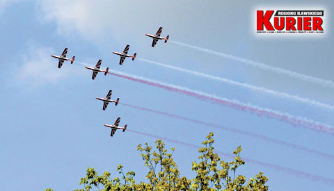Nadlatujące w zwartym szyku biało-czerwone ISKRY