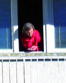 Zofia M. w swoim oknie. Kolejny już raz wybiła szybę.