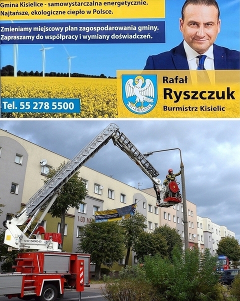 Ogromny baner reklamowy, podpisany „RAFAŁ RYSZCZUK, burmistrz Kisielic” – stał się bardzo groźnym żaglem i przy porywistych podmuchach wiatru niemal doprowadził do złamania i przewrócenia rozbujanego słupa latarni ulicznej. Tylko dzięki spostrzegawczości mieszkańca pobliskiego bloku nie doszło do katastrofy na zatłoczonej jezdni, parkingu lub chodniku. Przy sporym nakładzie środków i służb oraz dłuższej blokadzie ruchu w tym sektorze miasta, policja i strażacy zdemontowali niebezpieczną „zasadzkę”.