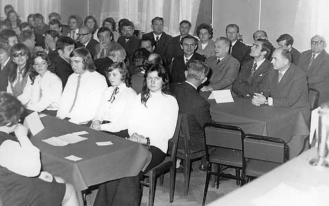 Iława. 1973 rok, sala IZNS. Powiatowy zjazd działaczy Związku Socjalistycznej Młodzieży Wiejskiej. Prezentujemy nazwiska tych, których po latach udało się rozpoznać (wielu osobom dziękujemy za pomoc w identyfikacji osób).
