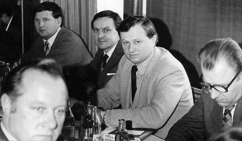 Iława. 1985 rok. Jedno ze spotkań, prawdopodobnie związanych z budownictwem wielorodzinnym. Za stołem od lewej siedzą: Lech Żendarski, wówczas prezes Spółdzielni Mieszkaniowej „Praca” (dziś kierownik Warsztatu Terapii Zajęciowej w Iławie), Tadeusz Listkowski, Eugeniusz Jaremko, dyrektor IPB (dziś także jego dyrektor naczelny i prezes) oraz major Wiesław Cwaliński, komendant miejski milicji w Iławie.