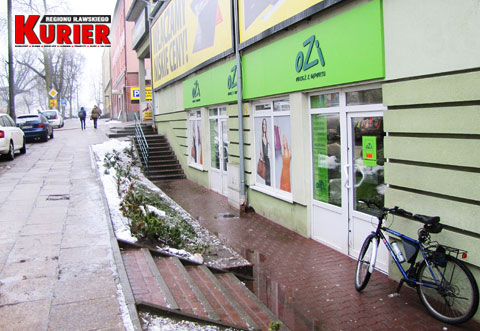 (w niebieskiej kurtce). Wychodzi ze sklepu