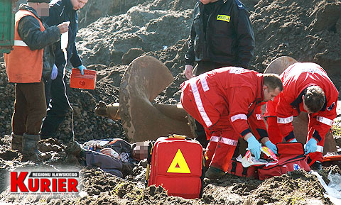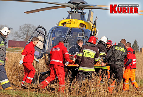 Metalowy element poważnie zranił Sławomira J., miażdżąc 44-latkowi głowę z prawej strony tuż obok oka oraz klatkę piersiową. Był przytomny, odpowiadał na pytania ratowników. Pracownik firmy Wiertmost ze Zwolenia w stanie ciężkim został przetransportowany śmigłowcem do szpitala w Grudziądzu.