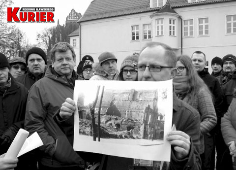 Dariusz Paczkowski pokazał ilustrację przedstawiającą widok ze starówki w stronę praktycznie nienaruszonego ratusza i kościoła, który został rozebrany w czasie budowy obwodnicy Starego Miasta.