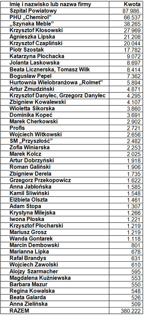 – Szpitalowi udzieliliśmy pomocy w postaci umorzenia podatku z uwagi na remont oddziałów – informuje Włodzimierz Ptasznik. – Firmy Chemirol oraz Szynaka Meble otrzymały pomoc z uwagi na utrzymanie stanowisk pracy. (olk)