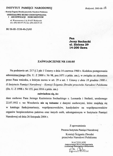 3. Już wiosną 2006 roku, po wielu kuluarowych insynuacjach wiceburmistrza Henryka Lisaja, przedłożyłem w prezydium Rady Miasta Iławy stosowny dokument, jaki otrzymałem z IPN, stwierdzający na moją prośbę, że nie pracowałem w strukturach organów bezpieczeństwa (pismo do wglądu zainteresowanych).